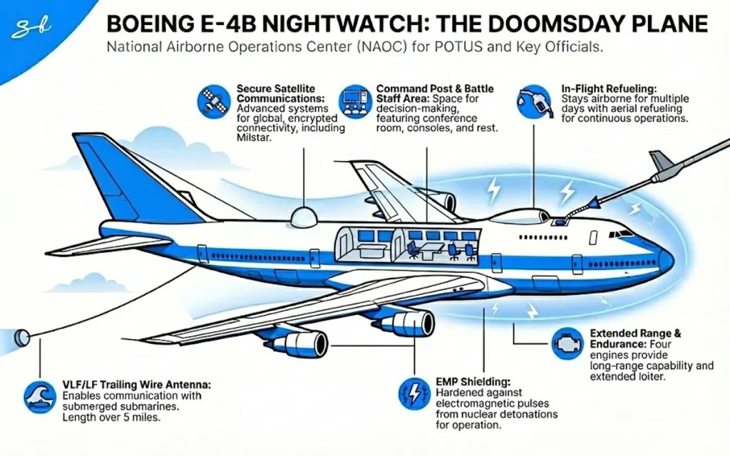 Boeing E-4B Nightwatch este un centru de comandă aerian complet funcțional, conceput pentru a asigura continuitatea conducerii Statelor Unite în cazul unui atac nuclear. Aeronava este capabilă să reziste efectelor unei explozii nucleare și face parte din strategia de supraviețuire a lanțului de comandă militar american.
